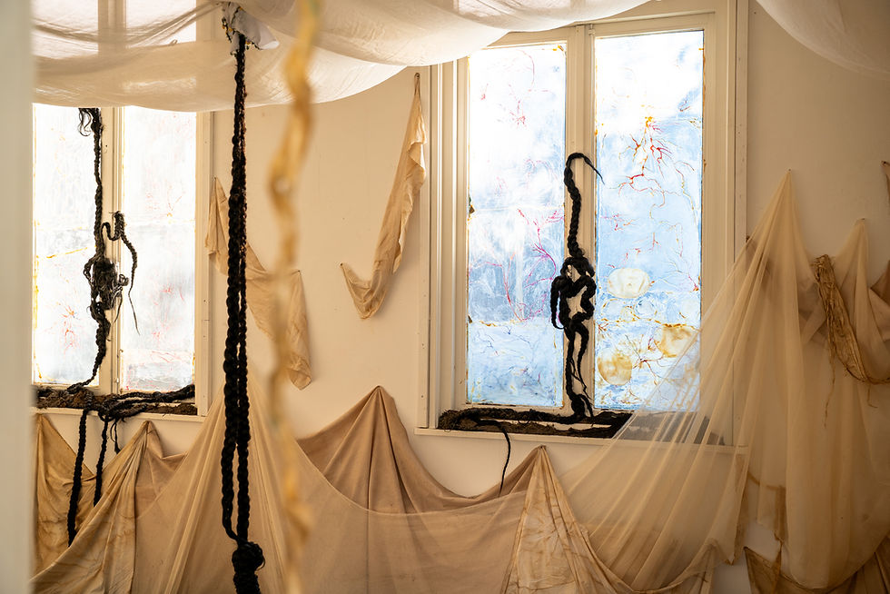 The installation is a collaboration between Alicia Kemp, Tirza Mafi, Renske de Jong and Gamze Öztürk. Four artists who share a fascination with the body as more than a biological entity. A living archive, a site of memory and transformation. through textile, soil, hair, latex, paint and sound, they create an environment that resists boundaries. Throughout a year of sleepovers, studio visits and sharing words and visions, their practices have grown towards each other. The exchange of media, symbols. and stories have formed works that are blending into one another.